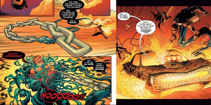 Usando Deathlok para acceder a su sistema nervioso, el cyborg asume todo el dolor que había impedido que Robbie accediera a todo su poder. Con la mente despejada, Robbie convoca a su poderoso Hellcharger mientras envuelve al Black Skull en cadenas, arrancando el simbionte Venom de su cuerpo. Ghost Rider también confirma sus poderes como All-Rider, pudiendo montar y conducir cualquier cosa dada su condición de Spirit of Vengeance único. Como tal, Robbie toma el mando del propio simbionte (¿qué es un simbionte sino un vehículo para que lo conduzca un anfitrión?).