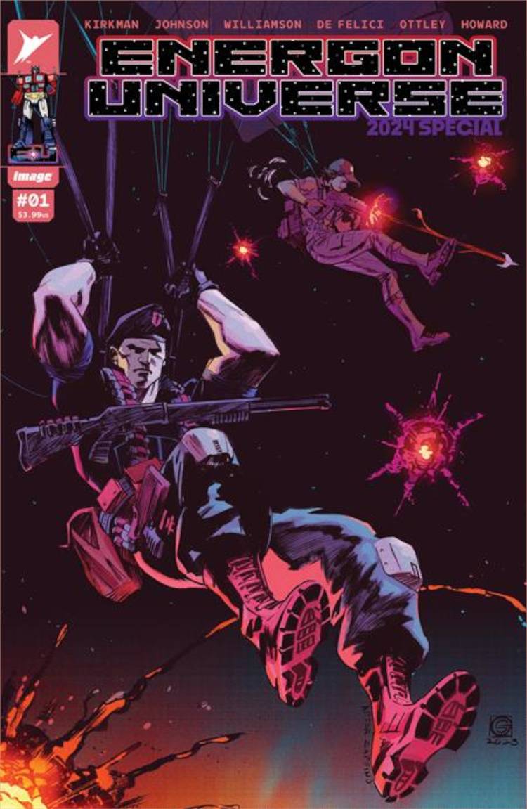 Lanzado el 8 de mayo, el Especial Universo Energon 2024 El número 1 es un reempaquetado del conjunto especial de FCBD que se lanzará el 4 de mayo, Día del cómic gratuito. Si bien el contenido del interior será el mismo, la nueva impresión incluirá portadas variantes, como la siguiente de Stephen Green que muestra a Flint y Lady Jaye lanzándose en paracaídas hacia la acción: