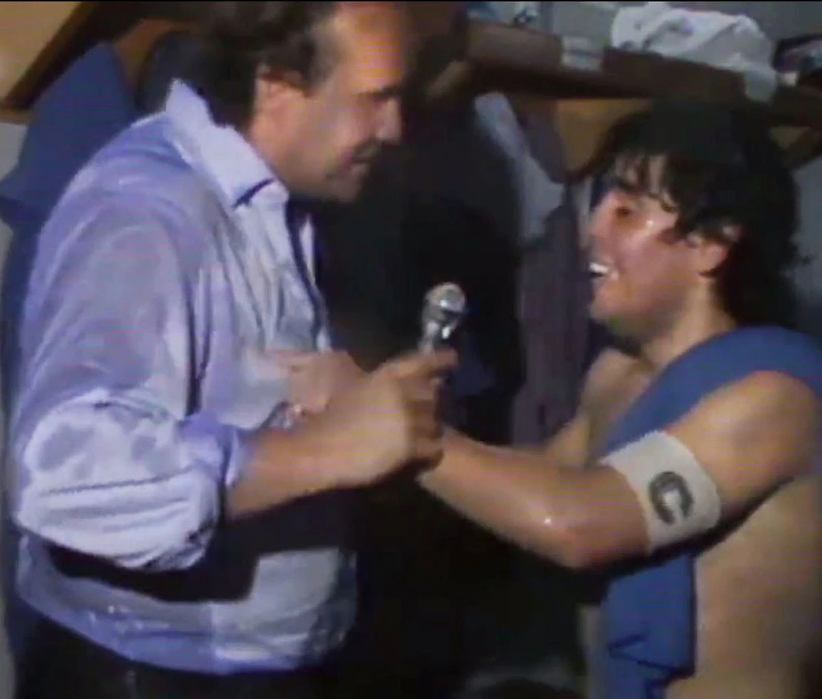 Giampiero Galeazzi se esfumó del campo con su micrófono y el cámara, bajaron al vestuario antes que nadie y se encerraron ahí a esperar a los jugadores. Era el 10 de mayo de 1987 y el Nápoles acababa de ganar su primer scudetto en el San Paolo. Cuando entraron Maradona, Careca y compañía lo acogieron como a uno más en el éxtasis de la celebración. Las imágenes son históricas. Lo bañan, beben champán juntos y al final, en un rapto de lucidez, Galeazzi le pasa el micro al argentino, que se marca una serie de entrevistas memorables a sus compañeros que ilustran mejor que casi ningún gol la gesta de aquel equipo pequeño guiado por un genio.