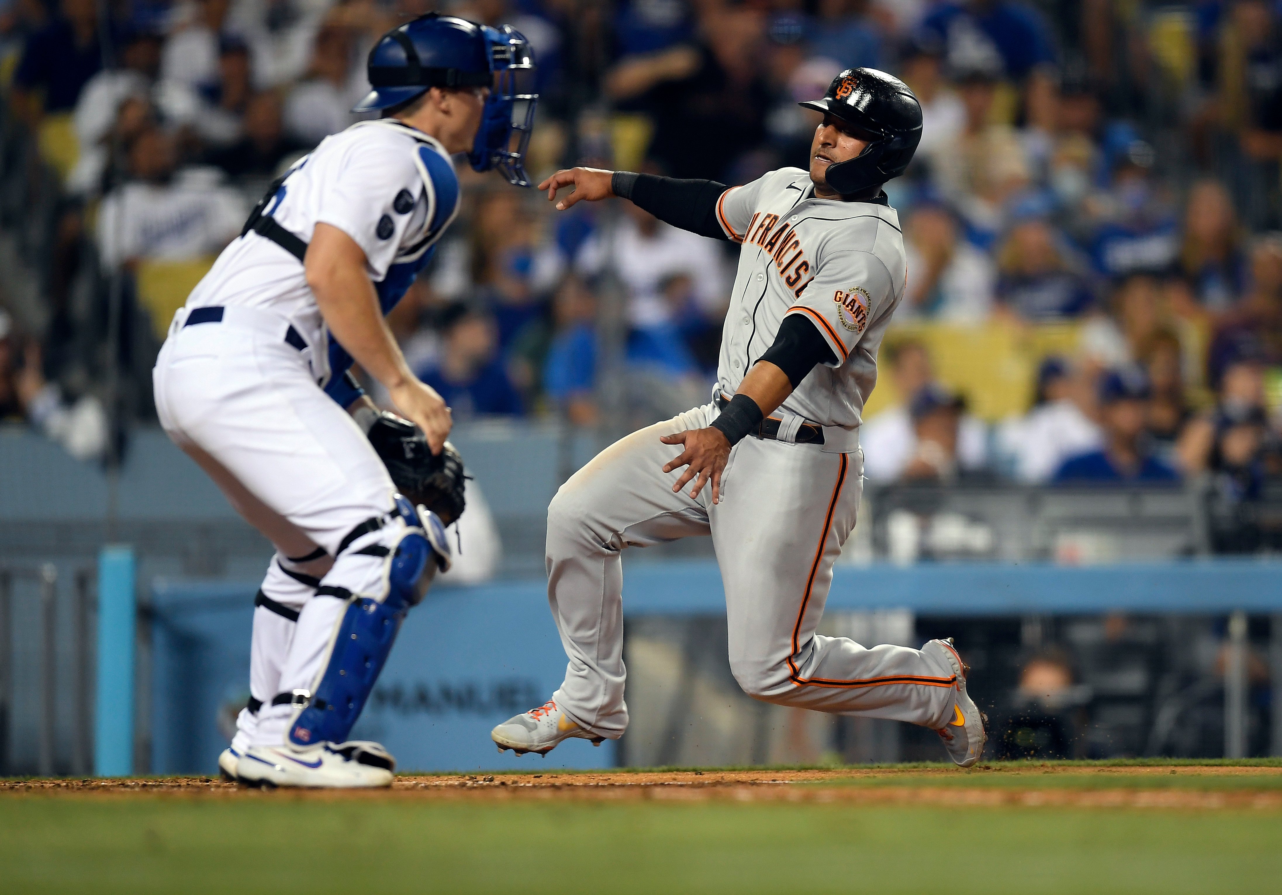 Buster Posey y Wilmer Flores pegaron jonrones consecutivos en el primer inning, Thairo Estrada logró un doble crucial en el séptimo y los Gigantes de San Francisco derrotaron el lunes 7-2 a los Dodgers de Los Ángeles en el primer juego de una serie decisiva entre los dos rivales del oeste de la Liga Nacional.
