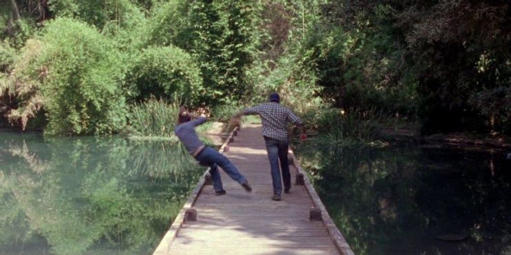 Temporada 2 de Chicas Gilmore presenta a Luke tratando de que su sobrino vea que Stars Hollow es un buen lugar para vivir, y Jess no quiere nada de eso. Cuando Luke espera a Jess fuera de la escuela y dice que quiere que sea más educado, maduro y ambicioso, Jess le dice a su tío que lo deje solo, y en la escena más divertida de la que los fanáticos siempre hablan, Luke empuja a Jess a un lago.