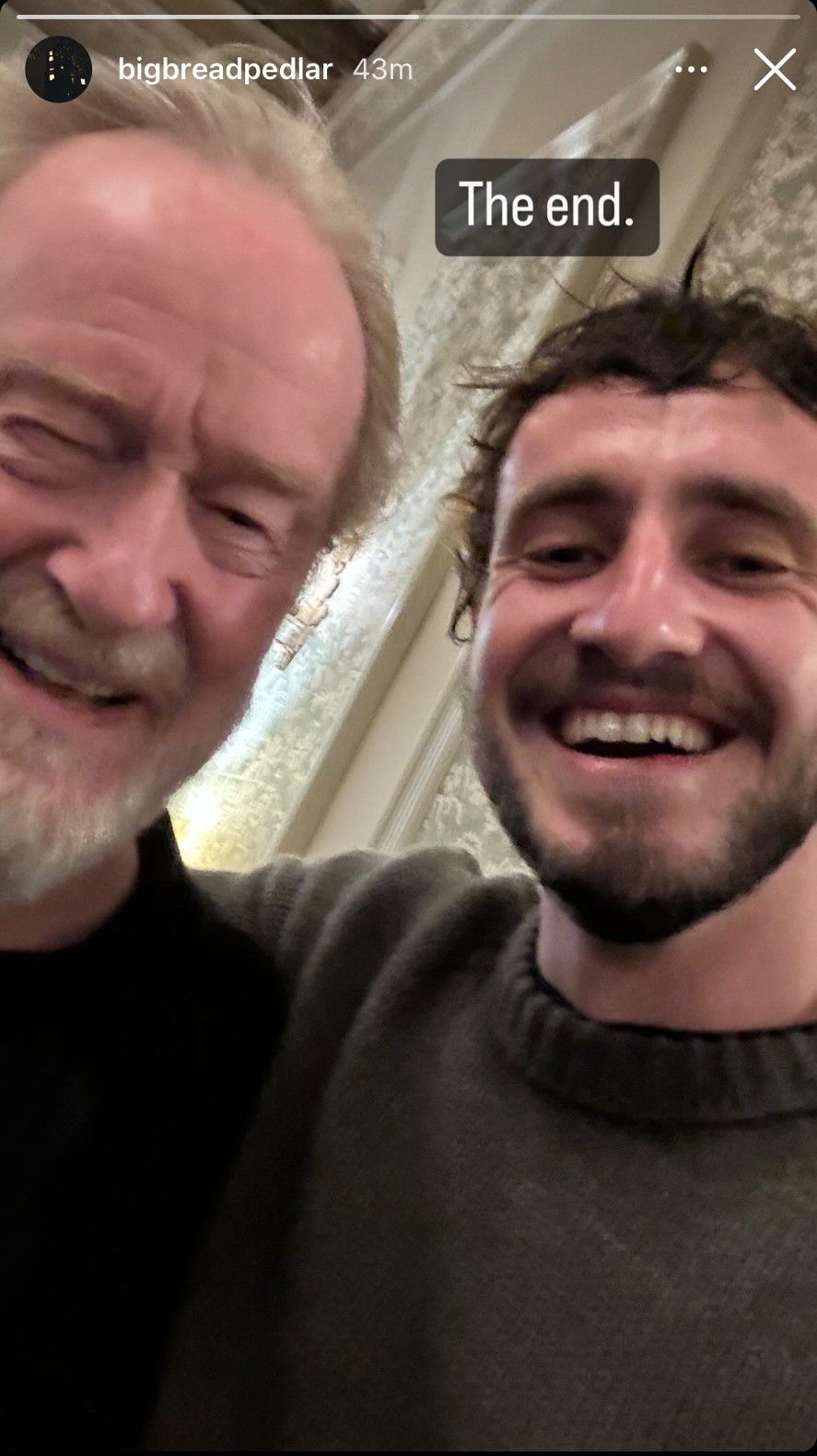 Gladiador 2 La estrella Mescal publicó una historia en su Instagram privado de que el rodaje de la secuela ya se ha completado. Para celebrar la hazaña, compartió una foto feliz con Scott con un breve texto que decía: “El fin.” Mira la imagen a continuación: