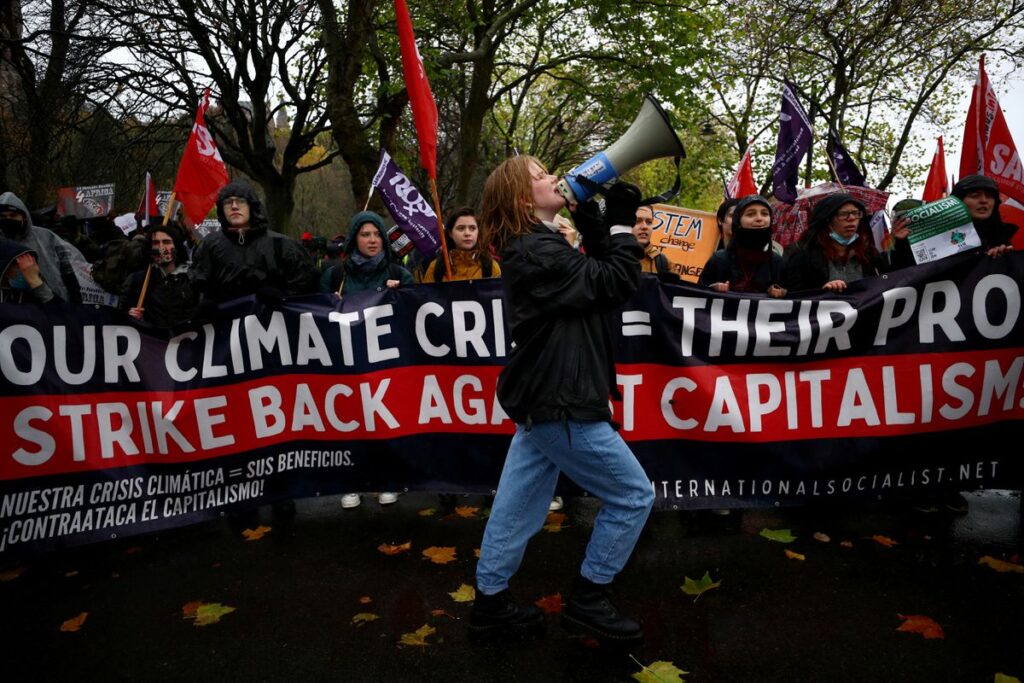 Decenas de miles de personas, 50.000 según los organizadores, recorrieron ayer las calles del centro de Glasgow para pedir justicia climática. Bajo la lluvia y el viento, la ciudad escocesa, sede de la COP26, ha vivido otra jornada de manifestaciones para exigir a los líderes políticos mundiales que se reúnen en la cumbre del clima más acción y menos palabras contra el calentamiento global. “Estoy aquí porque el Gobierno no está haciendo suficiente, y además nos están engañando mientras lavan su conciencia ecologista“, lamenta Sharlotte Roberts, estudiante de 16 años, que ha venido a la marcha desde Edimburgo con amigos.