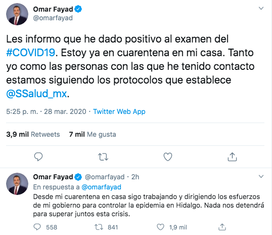 “Desde mi cuarentena en casa sigo trabajando y dirigiendo los esfuerzos de mi gobierno para controlar la epidemia en Hidalgo. Nada nos detendrá para superar juntos esta crisis”, tuiteó.