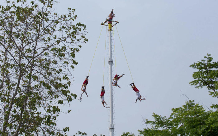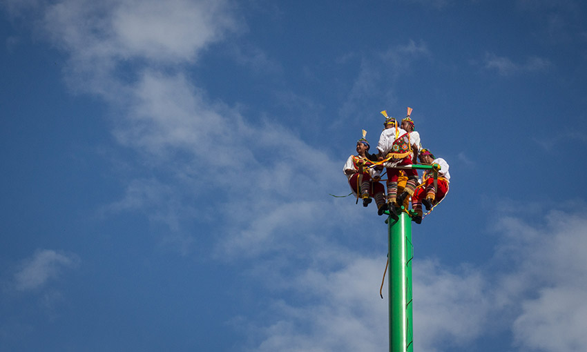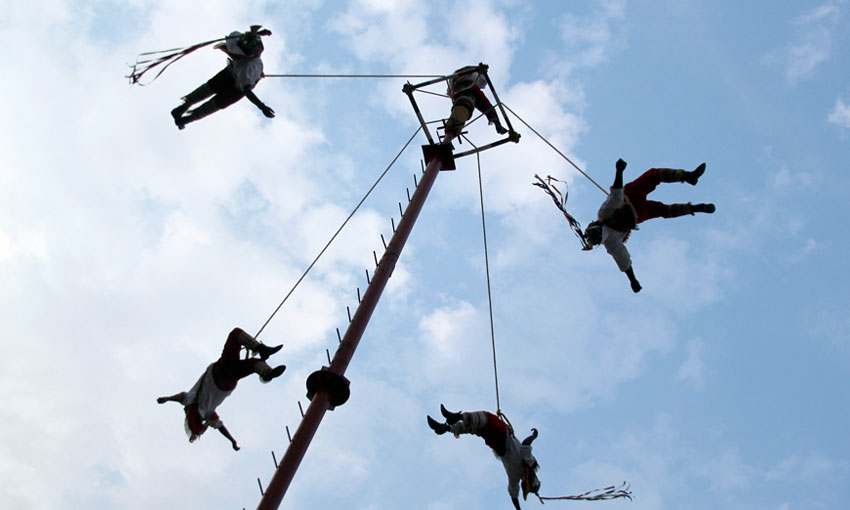 Señala que la ceremonia de los voladores está relacionada con la fertilidad y se remonta a tiempos ancestrales en los que, con el permiso del Dios del Monte, cinco jóvenes buscaban el árbol más alto y mediante la invocación de los cuatro puntos cardinales y del centro del universo, pedían para que regresara la lluvia.