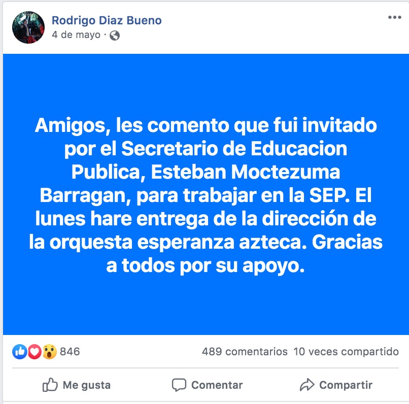 “Amigos les comento que fui invitado por el secretario de Educación, Esteban Moctezuma Barragán, para trabajar en la Secretaría de Educación Pública. El lunes haré entrega de la dirección de la orquesta esperanza Azteca. Gracias a todos por su apoyo”, dijo entusiasmado Díaz Bueno el 4 de mayo del año pasado en su cuenta de Facebook.
