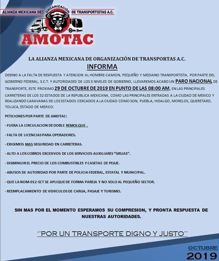 El lunes, la Alianza Mexicana de Organización de Transportistas A.C. (AMOTAC), anunció en un comunicado que, a partir de este martes a las 8:00 horas, llevaría a cabo un paro nacional en los 32 estados del País.