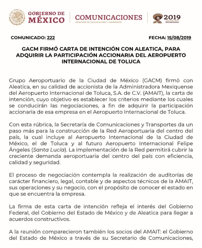El gobierno, a través del Grupo Aeroportuario de la Ciudad de México, acordó con la empresa Aleatica (antes OHL) el inicio de las negociaciones para comprarle el 49 por ciento de las acciones del Aeropuerto Internacional de Toluca.