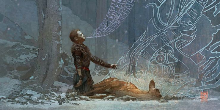 El ciervo caído representado en el arte conceptual extrañamente conmovedor bien puede ser el que Atreus lucha por cazar y matar en el juego. Los jugadores nunca ven la escena representada en la hermosa obra de arte, pero no es difícil imaginar que el niño ofrecería una canción o incluso una oración en esa situación.