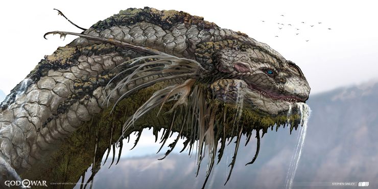 El hermoso arte conceptual que muestra el diseño de la enorme criatura brinda a los jugadores una pista importante sobre cuánto tiempo ha pasado Jörmungandr sumergido en el lago. Con algas formándose alrededor de su mandíbula y sus aletas luciendo cansadas y desfiguradas, la criatura puede haber existido por bastante tiempo.