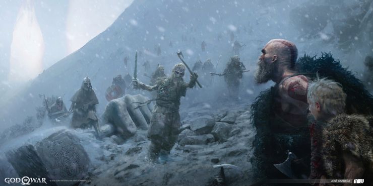 Una notable obra de arte lanzada por los desarrolladores destaca la protección de Kratos hacia Atreus, mientras se para frente a él mientras un grupo de enemigos no muertos se precipita hacia ellos. A juzgar por la nieve, es una escena de Hel y también una de sus primeras representaciones. Las criaturas no se parecen exactamente a los Hel-Walkers más intimidantes que los jugadores encuentran en el juego y, por supuesto, el cabello rubio de Atreus no es lo que termina en la versión final.