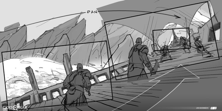 Una pieza de arte conceptual única que parece un boceto aproximado subraya el proceso de pensamiento que se llevó a cabo en la secuencia bien coreografiada. Los marcos y una flecha gigante guían a los personajes a través del barco hacia los muertos vivientes.