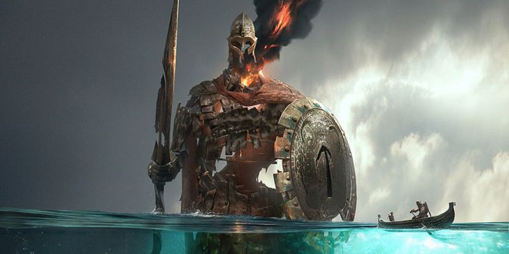 Una impresionante obra de arte muestra una estatua en descomposición de Tyr en llamas en medio del Lago de los Nueve. No se puede culpar a los fanáticos por no notar a Atreus y Kratos en un bote justo al lado, ya que, como era de esperar, se ven empequeñecidos por la enorme estructura.