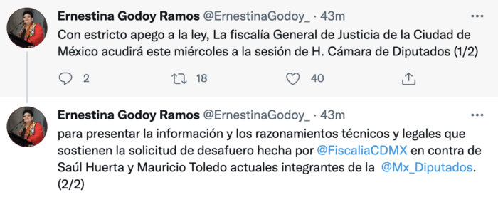 La titular de la Fiscalía General de Justicia de la Ciudad de México, Ernestina Godoy Ramos, anunció que acudirá este miércoles a la Cámara de Diputados para presentar la información y los razonamientos técnicos y legales que sostienen la solicitud de desafuero hecha por la dependencia a su cargo contra los legisladores Saúl Huerta y Mauricio Toledo.