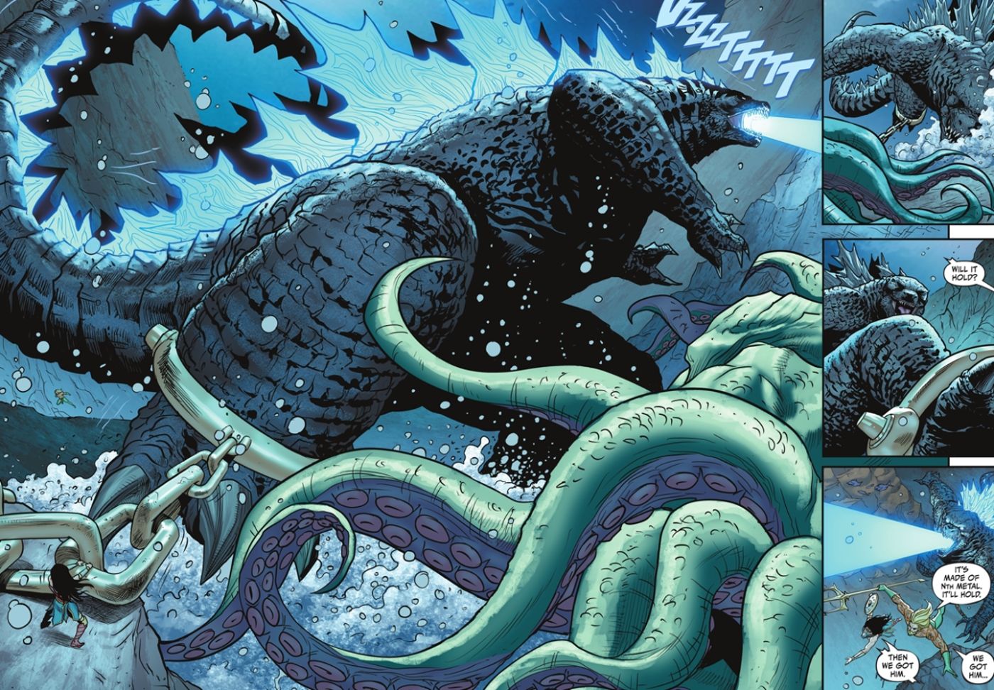 Aquaman y Wonder Woman intentan atrapar a Godzilla mientras Mera vigila la Atlántida. Mientras el Titán lucha contra el Kraken, Aquaman asegura una esposa hecha de metal Nth alrededor de la pierna de Godzilla. Godzilla no puede perseguir a los dos héroes. y está atrapado en el fondo del mar.