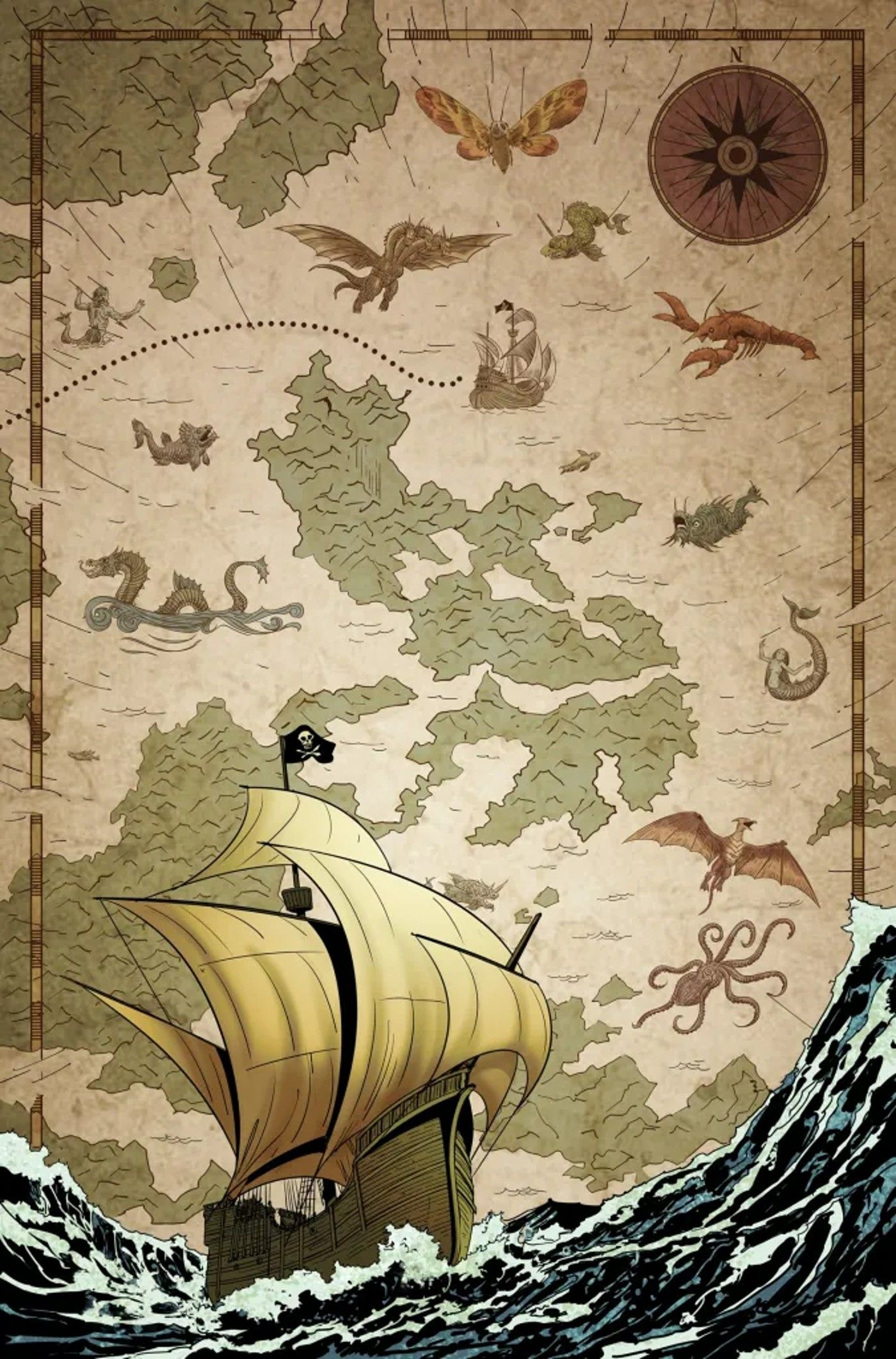 En la serie de 1996 de Dark Horse Comics Godzilla: Rey de los Monstruos un supervillano encuentra la manera de enviar a Godzilla a través del tiempo para causar estragos en la historia, y en el número 10, el monstruo se enfrenta a la Armada Española en 1588, en la que Drake también estuvo presente. IDW también publicó una serie completa sobre Godzilla a lo largo del tiempo en su miniserie de 2016. Godzilla: Rabia a través del tiempoenfrentando al monstruo contra los dioses griegos entre otras amenazas. Godzilla: Aquí hay dragones utiliza la clásica frase utilizada en los mapas marineros “Aquí hay monstruos” para establecer que… sí… realmente eran monstruos en alta mar! Una de las páginas de vista previa del cómic incluye uno de esos mapas, mientras muestra otros monstruos Toho infames, incluidos Rodan, King Ghidorah, Mothra y el kaiju Ebirah con base en el mar. El director editorial de IDW, Jamie S. Rich, ha confirmado que aparecerán otros monstruos en el cómic. Aquí hay dragones El escritor Frank Tieri dijo lo siguiente sobre la próxima serie: