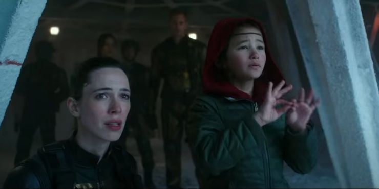 El metraje mostrado entre 1:27 y 1:29 podría tomarse de Godzilla contra Kong finalizando [via YouTube]. Aquí, cuatro de los personajes humanos parecen estar en un puesto de avanzada en un entorno nevado. Se puede suponer por los enfáticos gestos con las manos de Jia (Kaylee Hottle), la chica que puede hablar con Kong a través del lenguaje de señas, que es el Titán quien tiene su atención. La siguiente toma muestra a Kong parado en la nieve, presumiblemente mirándolos. Es posible que lo que en realidad muestra este metraje sean los humanos despidiéndose de Kong, cuya batalla con Godzilla ha concluido recientemente. Eso parece plausible, ya que esta ubicación no parece ser el escenario de ninguna de las acciones que se muestran en los múltiples avances y anuncios de televisión. Eso podría deberse a que este lugar solo se visita en los minutos finales de la película.