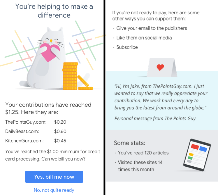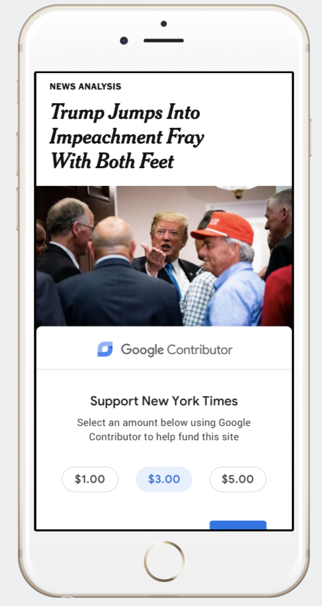 Google ingresó al espacio de financiación de editores con Google One Pass en 2011, ayudando a los usuarios a comprar suscripciones a sitios antes de que se cerrara un año después. En 2014, el Colaborador de Google se lanzó para permitir que las personas paguen una tarifa mensual a cambio de la eliminación de anuncios en sitios asociados, pero ese programa concluyó a fines de 2016.