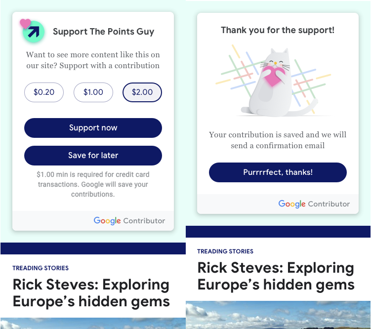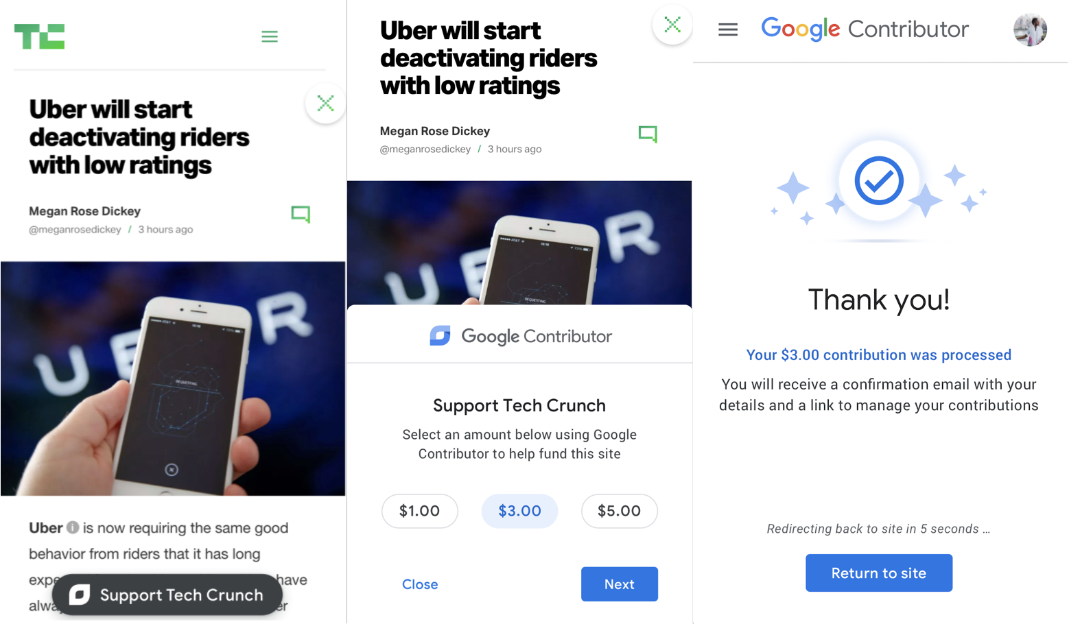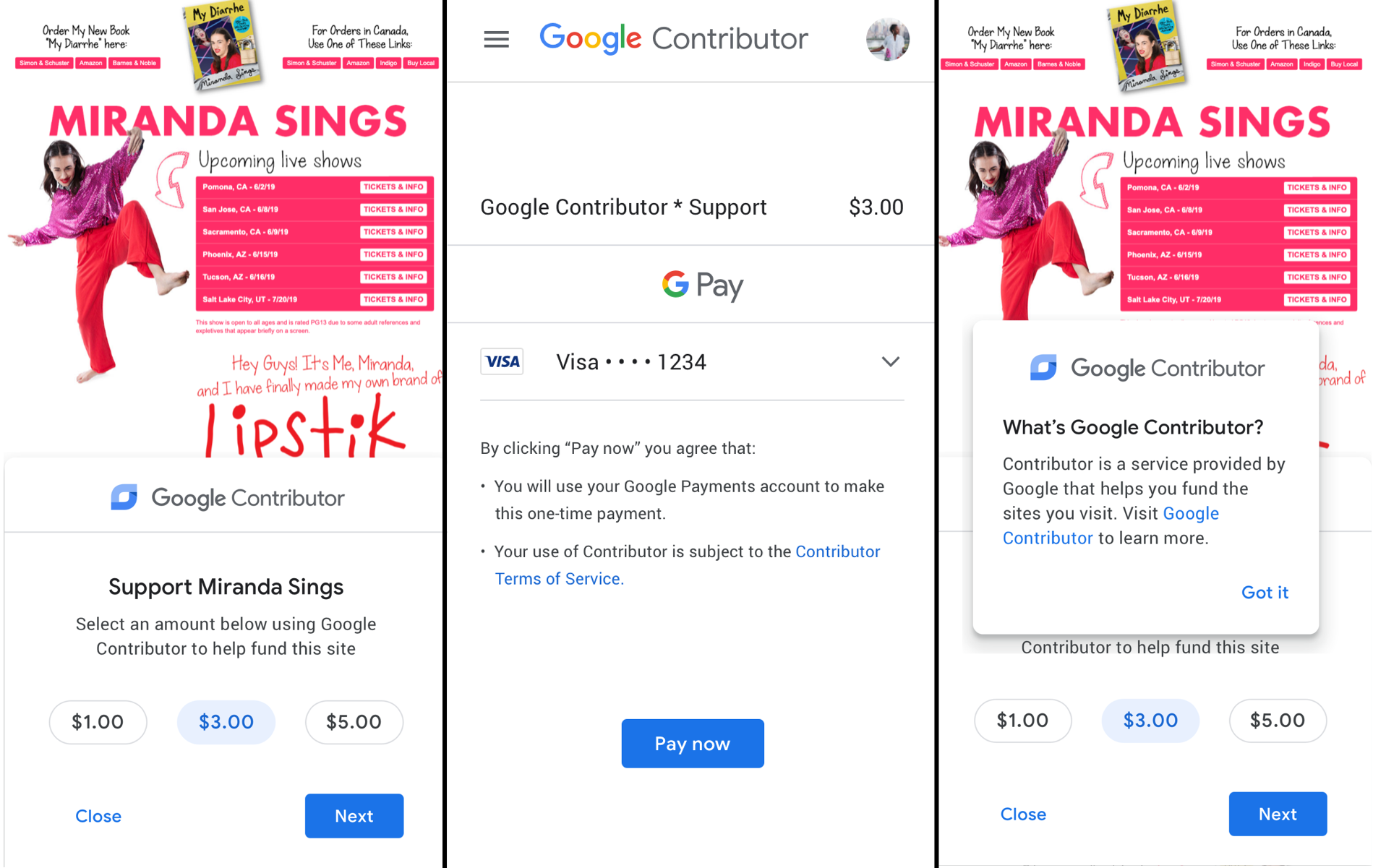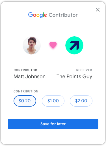 Después de elegir uno, los usuarios inician sesión en su cuenta de Google si aún no lo han hecho, y luego “Al hacer clic en” Pagar ahora “, acepta que: Utilizará su cuenta de Google Payments para realizar este pago único”. Luego regresa a la página que estaba viendo, con el botón que dice “¡Gracias por su apoyo!” antes de reducirse solo al logotipo de Colaborador.