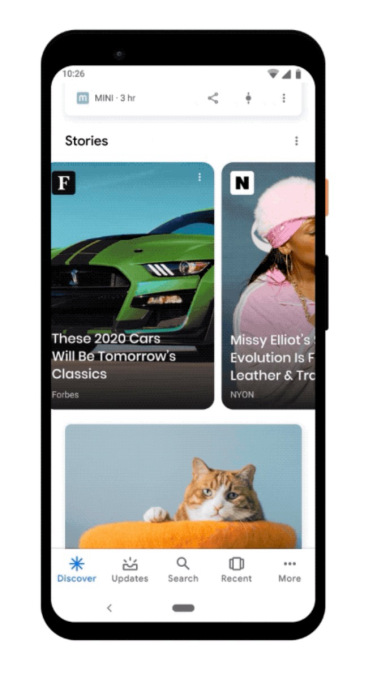 Aquí, los usuarios verán la fila de Historias web en la parte superior de la pestaña Descubrir, donde pueden tocar para ingresar a la experiencia de Historias en pantalla completa. Al igual que las historias que se encuentran en otras aplicaciones, puede tocar para avanzar a la página siguiente en una historia web de Google o deslizar para pasar a una historia diferente en el carrusel.