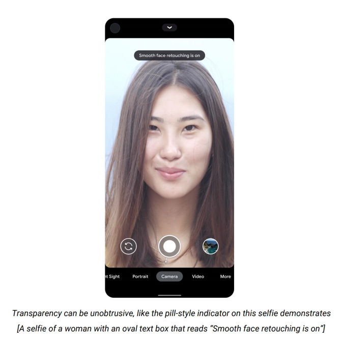 Google dice que la aplicación Cámara también debería dejar en claro cuándo se ha habilitado un filtro, tanto en la captura en tiempo real como después. Por ejemplo, un indicador en la parte superior de la pantalla podría informar al usuario cuando se ha activado un filtro, para que los usuarios sepan que su imagen está siendo editada.