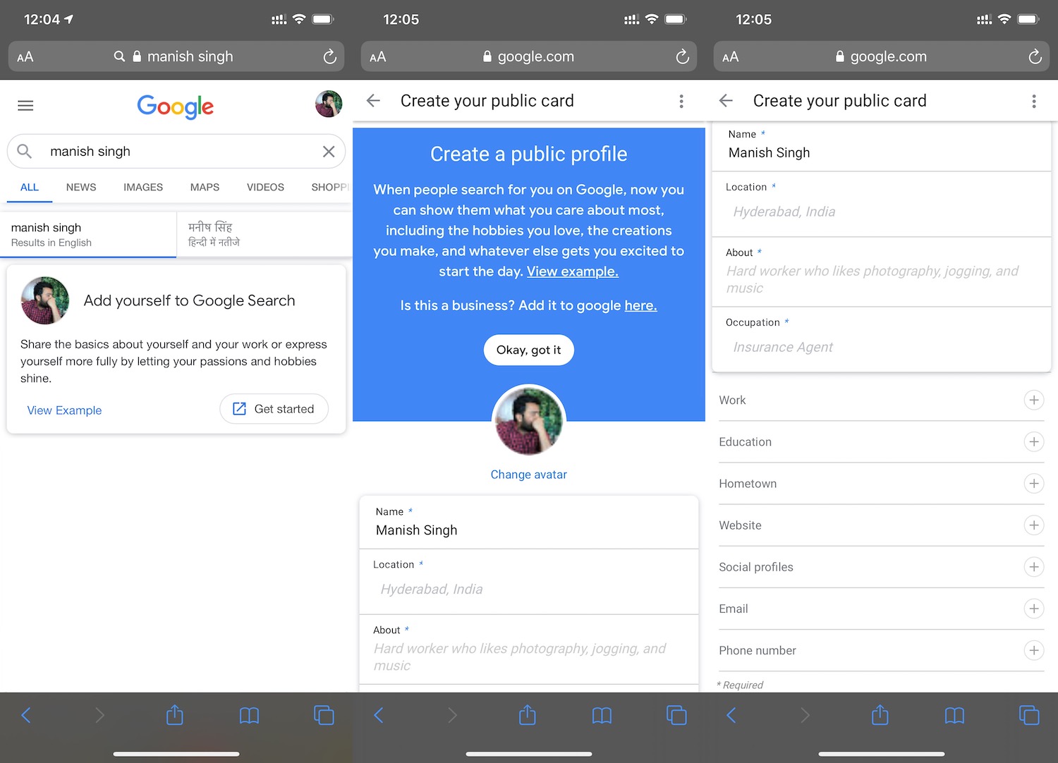 Los usuarios pueden crear tarjetas personales sobre sí mismos al iniciar sesión en su cuenta de Google y luego buscar su nombre en la búsqueda de Google. Esto abrirá una nueva opción llamada “agregarme a la búsqueda” o “comenzar”; tocando que abrirá un formulario que solicita a los usuarios que proporcionen una biografía (descripción) de sí mismos, su imagen (de forma predeterminada, Google obtiene la imagen asociada con la cuenta de Google de un usuario), enlaces a su sitio web y perfiles de redes sociales y, opcionalmente, sus número de teléfono, dirección, detalles laborales y educativos y dirección de correo electrónico.