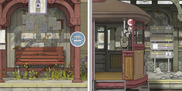 Un pedazo de papel caerá del letrero en el lado izquierdo de este panel en el Capítulo 5 de Gorogoa, lo que permite a los jugadores hacer zoom en el mapa del tren detrás de él. Aparecerá un tren en las vías del mapa y comenzará su camino hacia la primera parada. En el panel con el banco, los jugadores deben desplazarse hacia la izquierda dos veces y acercarse al arco en la parte posterior. La vía del tren en este arco se alineará con el mapa del tren una vez que los jugadores hagan zoom en ambos y coloquen el panel del mapa del tren debajo del panel del arco para completar la vía. Esto permitirá que el tren abandone el bucle y continúe a la siguiente sección del mapa. Luego, los jugadores pueden regresar al banco rojo en la estación de tren y esperar. Cuando el tren llegue al final de la vía en el mapa, aparecerá en la estación y dejará al chico de la camisa roja, y se dirigirá al lado izquierdo del panel.