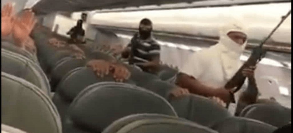 En un video que circula en redes sociales se observa cómo los sujetos que supuestamente fungen como los secuestradores, les dan instrucciones a los pasajeros del vuelo y a las sobrecargo.