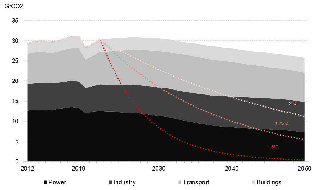 Los modelos de la compañía muestran que las emisiones globales disminuyeron aproximadamente un 20% como resultado de la respuesta internacional a la pandemia de COVID-19, y aunque esas emisiones aumentarán nuevamente con la recuperación económica, los modelos de BloombergNEF nunca ven que las emisiones alcancen los niveles de 2019. Y a partir de 2027 se prevé que las emisiones caigan a una tasa del 0,7% anual hasta 2050.