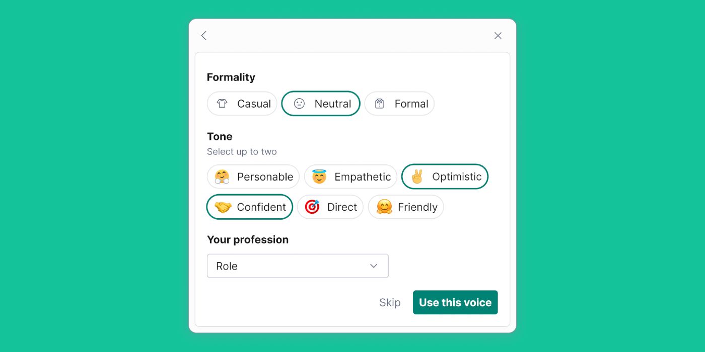 Cuando se trata de crear un esquema, GrammaryGo puede responder a un mensaje como “Dame un esquema para un resumen del proyecto “ generando automáticamente un plan detallado que los usuarios pueden aprovechar. Una vez que GrammarlyGo genera un resultado, los usuarios pueden pedirle a la IA que lo refine aún más mejorando, acortando o simplificando. GrammarlyGo también permite a los usuarios elegir hasta dos tonos específicos para redactar el texto, con opciones como optimista, confiado, directo, amigable, afable y empático. También pueden seleccionar un nivel de formalidad, como informal, neutral o formal. Finalmente, los usuarios pueden seleccionar una profesión de una lista desplegable para personalizar aún más el contenido.