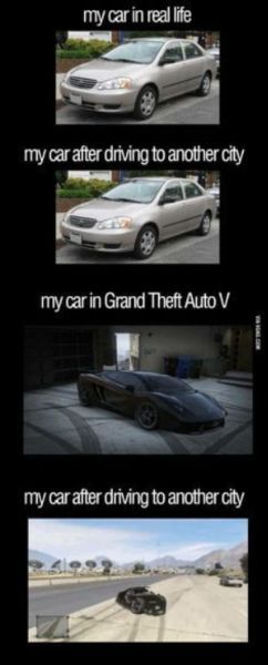 Por supuesto, ese no es el caso en el mundo real donde las personas compran autos en lugar de robarlos y, por lo tanto, tienen cuidado de no dañarlos. Este meme resume sucintamente las actitudes de los jugadores hacia la conducción. GTA contra la vida real.