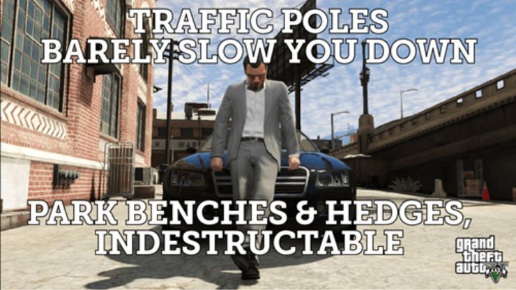 En Grand Theft Auto V Sin embargo, la lógica es exactamente lo contrario, y los jugadores pueden atravesar tantos postes como quieran sin sufrir daños importantes, pero cuando se trata de setos, son el equivalente a chocar contra un muro fortificado de ladrillos, como destaca perfectamente este meme.