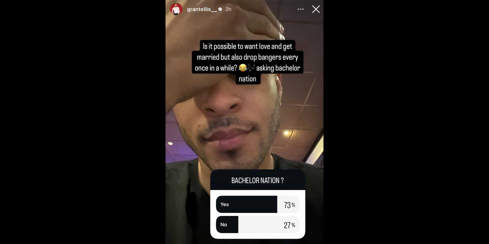 En una historia de Instagram Conceder abordó la reacción de Bachiller Los fanáticos que cuestionaron si realmente podría tomarse en serio la búsqueda de su futura esposa si quisiera promover su carrera musical. Compartió una fotografía de sí mismo cubriéndose los ojos con la mano con la leyenda, “¿Es posible querer el amor y casarse, pero también deja bangers de vez en cuando? [crying laughing emoji]. Preguntando a Bachelor Nation “. Grant también POSuced una encuesta en la que el 73% de las personas que respondieron dijeron que símientras que el 27% dijo que no.