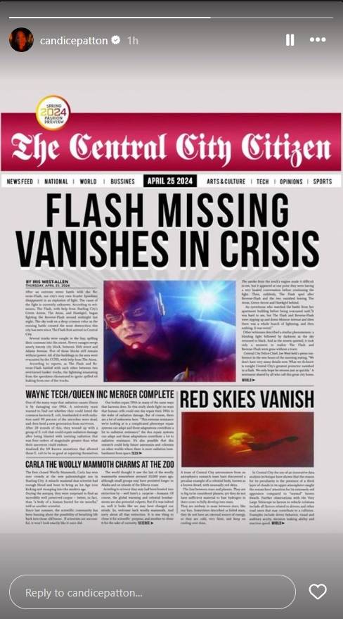 Candice Patton, quien interpretó a Iris West-Allen en El flash durante toda su carrera, también celebró el evento de hoy al compartir una imagen del titular de 2024. En El flash En la serie, Iris fue quien escribió el artículo sobre la desaparición de Scarlet Speedster en una crisis.