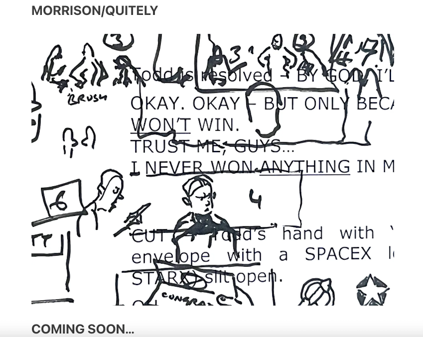 El 28 de febrero de 2024, Morrison reveló en su boletín Substack lo que parece ser un adelanto de un próximo proyecto de cómic. El teaser presenta de manera destacada las palabras “MORRISON/TRANQUILO,” insinuando un esfuerzo de colaboración entre los dos creadores, y precede a una imagen que muestra varios bocetos junto con notas escritas a mano, incluido “Cepillar” y lo que parece ser la primera mitad de la palabra “Felicidades.“