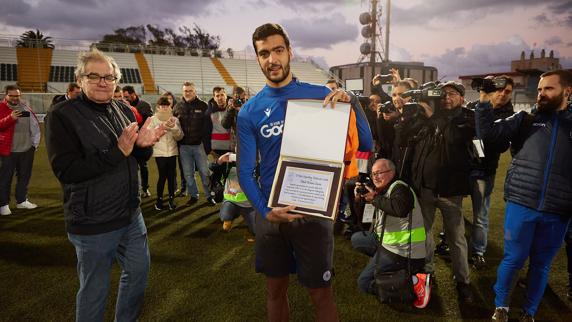 Hamido, presidente ceutí y autor de la frase célebre “pa chulo, chulo, mi pirulo”, un directivo del Ceuta enseñaba con orgullo la ficha prebenjamín de Merino, al que obsequió con una camiseta oficial y una placa. El navarro correspondió firmando y regalando la txuri urdin con su nombre y su número, el ‘8’.
