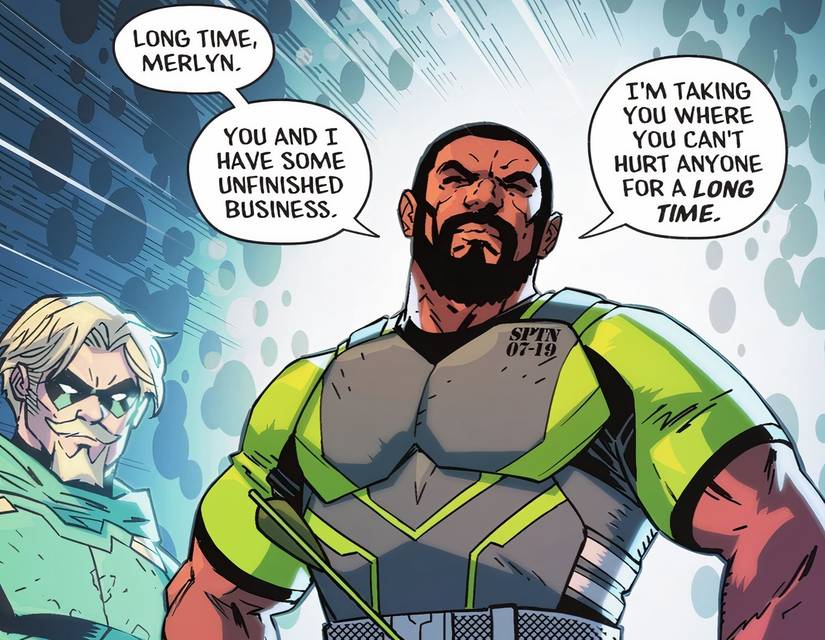 Afortunadamente, Green Arrow toma la delantera después de que llega el verdadero Equipo Arrow para derrotar a las construcciones. Oliver derrota a Merlyn y se lo entrega al viejo amigo de Green Arrow, John Diggle. Diggle, ahora vestido con una armadura que dice “SPTN 07-19”, le desea lo mejor a Oliver y su familia antes de llevar a Merlyn a las autoridades correspondientes.