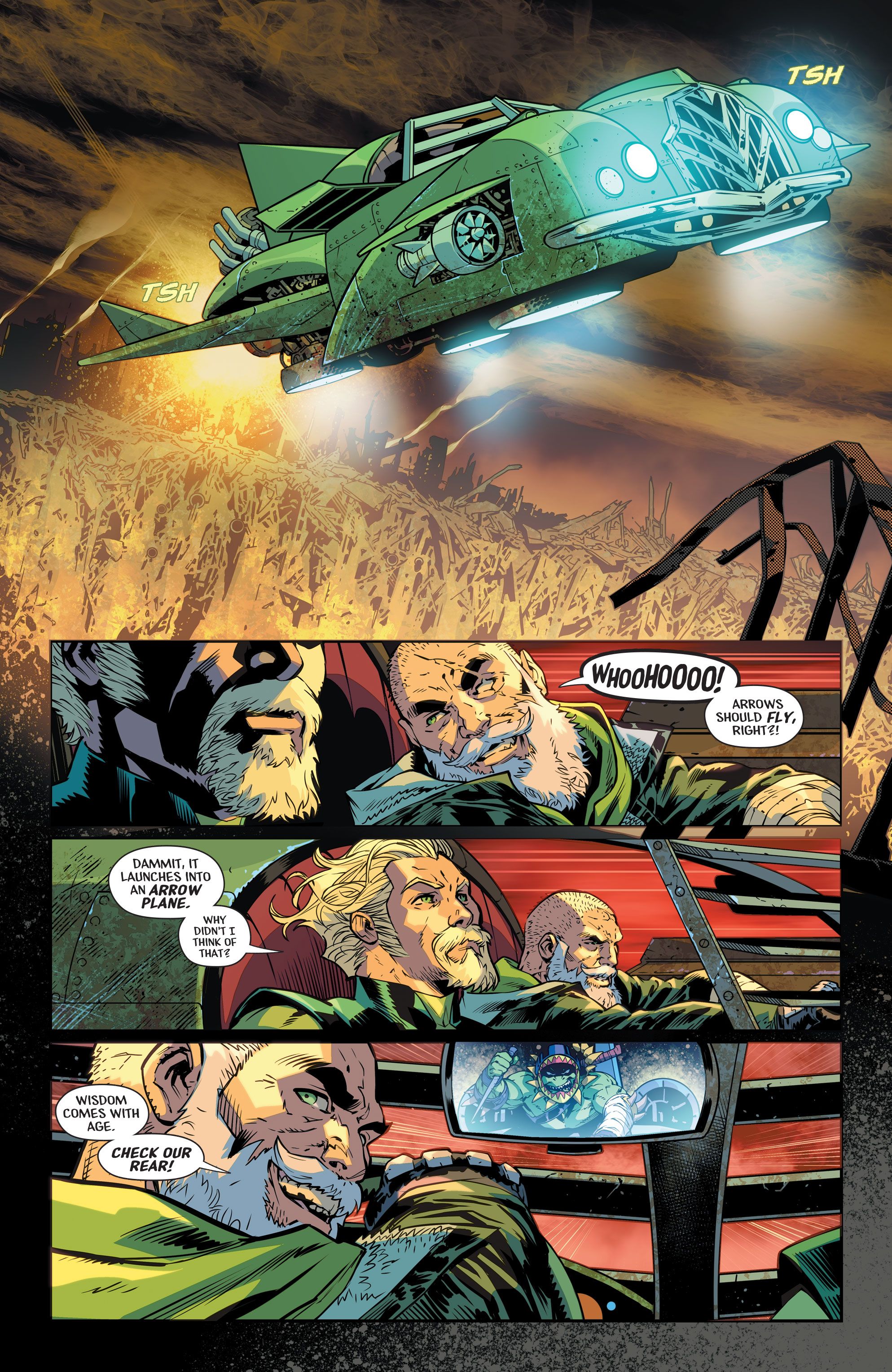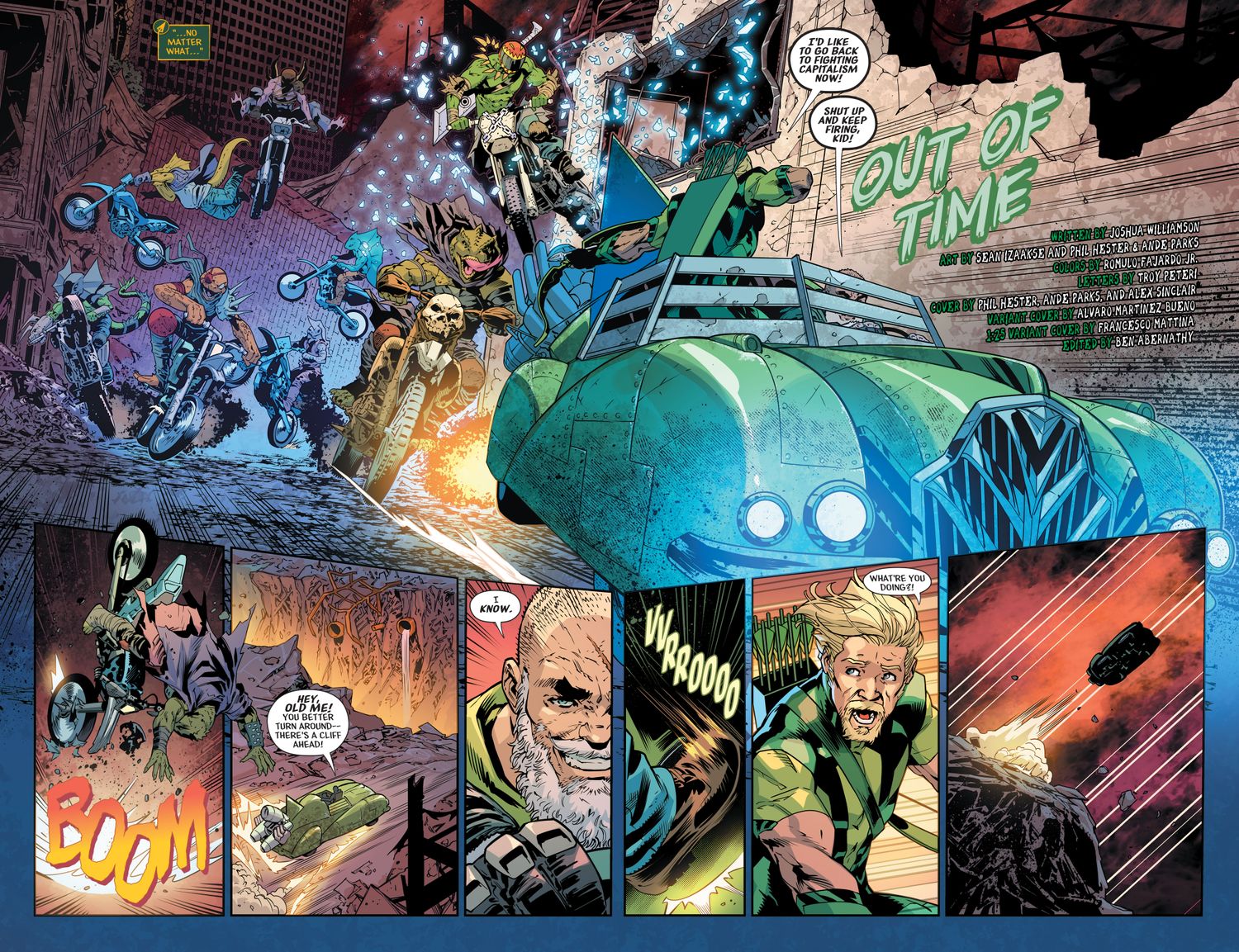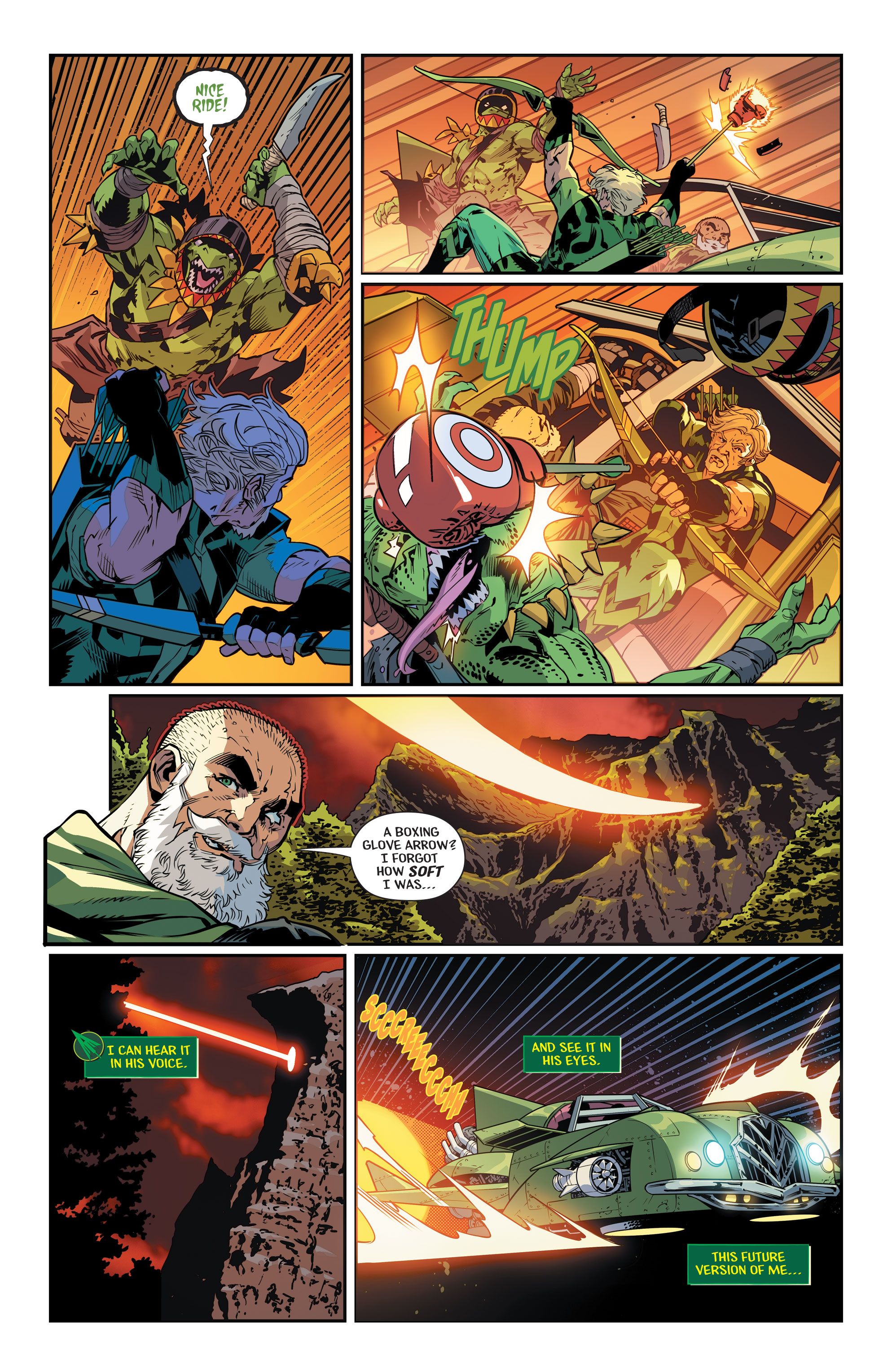 “/> En un adelanto de Flecha verde n.° 5 Por Joshua Williamson, Sean Izaakse, Phil Hester y Ande Parks, el hijo de Oliver, Connor Hawke, sale a buscar a su padre con la Legión de Superhéroes. Mientras tanto, Green Arrow y su yo mayor luchan por sobrevivir mientras son perseguidos por un grupo de motociclistas hombres lagarto. Mientras surcan los cielos en un Arrow Plane modificado, un villano se cuelga del barco. El joven Oliver se ocupa del criminal hambriento con su confiable guante de boxeo Arrow, pero a pesar del éxito, el mayor Green Arrow critica la ridícula opción no letal de su yo más joven.
