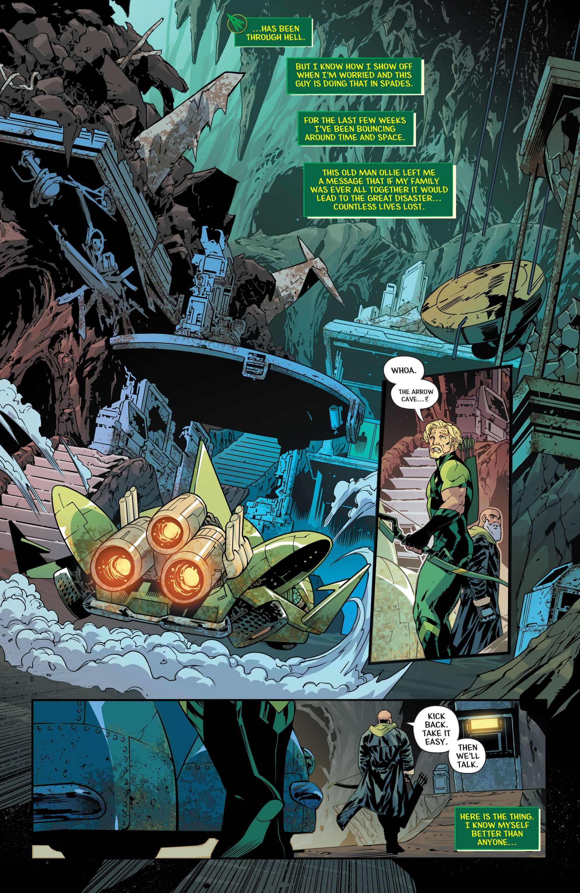 Green Arrow fue separado de sus seres queridos más cercanos después de los eventos de Crisis oscura en tierras infinitas y desde entonces, Oliver ha estado por todos lados. Más recientemente, terminó en el futuro con la hija de Roy Harper, Lian, donde descubrió una grabación que revelaba que la unión del Equipo Arrow causaría un gran desastre que dejaría miles de millones de muertos.