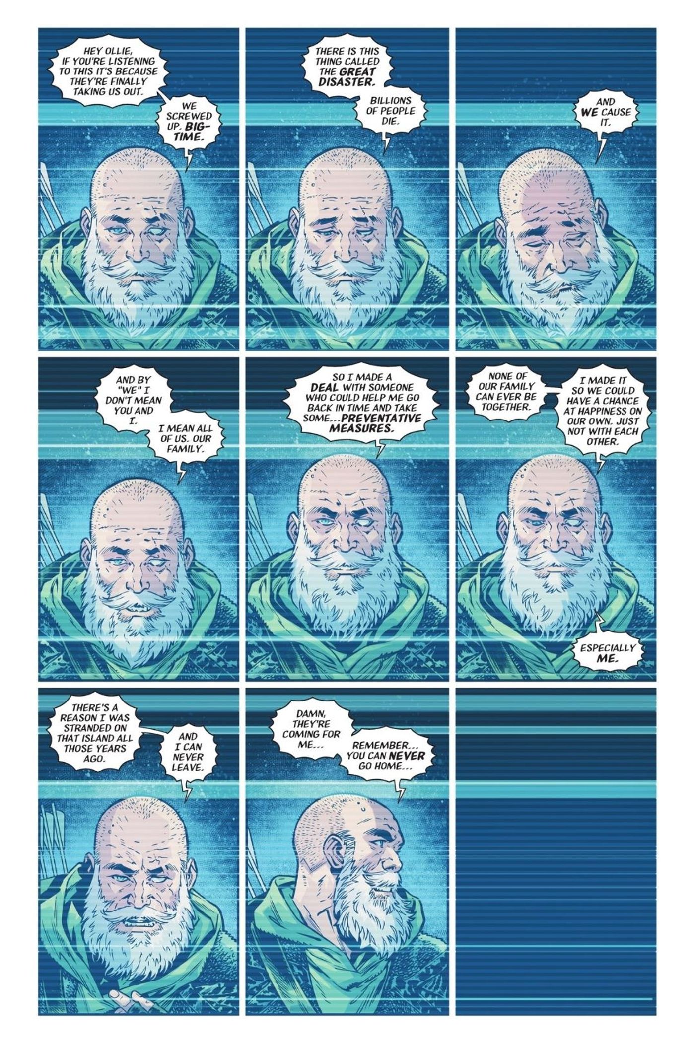 “/> La verificación de esta historia fue una variante de la forma villana de Hal Jordan, Parallax, quien afirmó que Oliver acudiría a él para pedirle prestado poder temporal para garantizar que la familia Queen permaneciera dividida. Después de una pelea con Parallax, Oliver quedó varado en el futuro, donde conoció a su yo mayor y canoso.