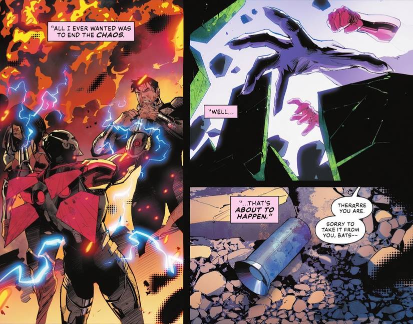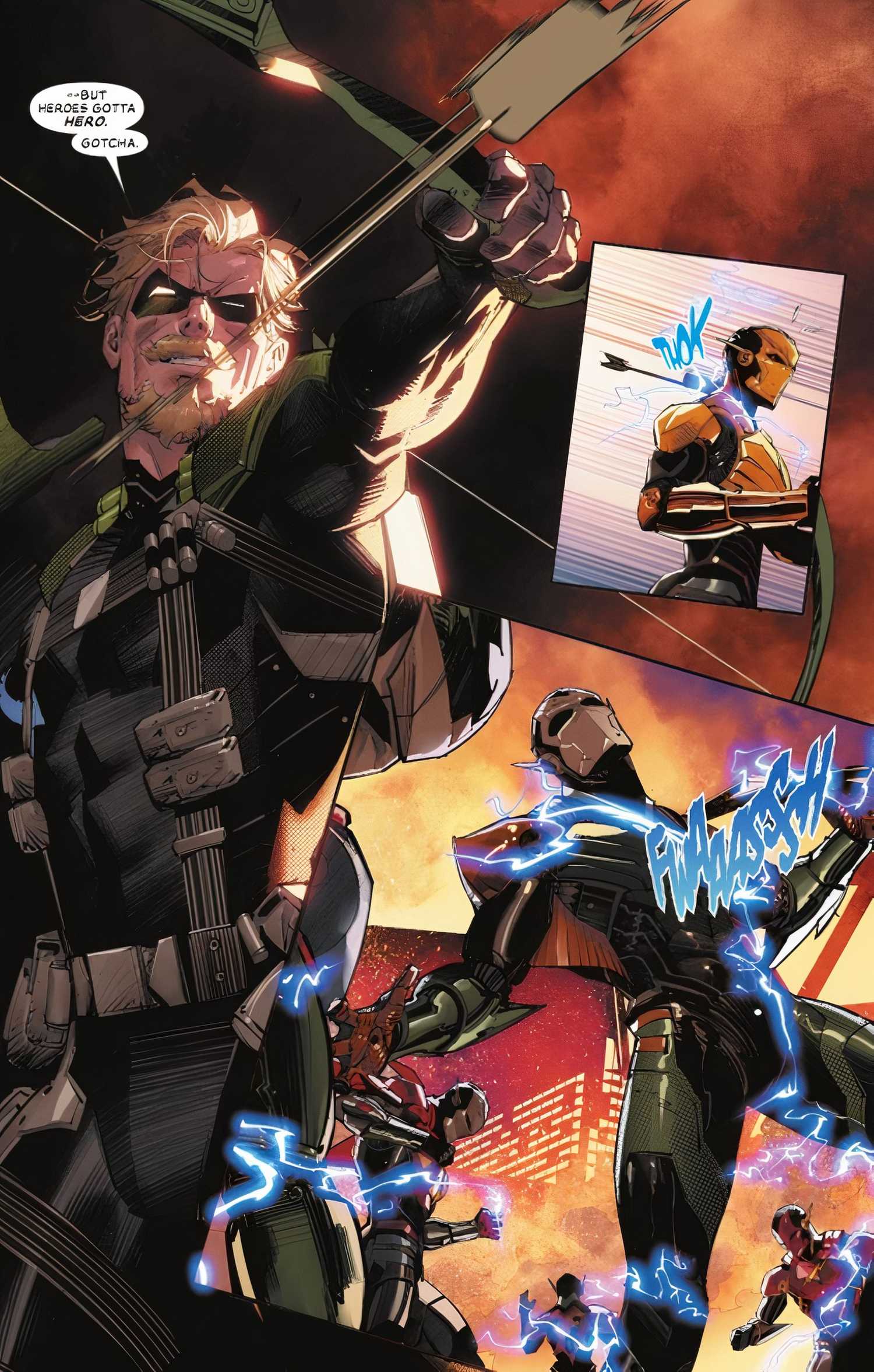 Oliver Queen también se encuentra en una situación matizada cuando se trata de afirmar que derrotó al Task Force VII, el equivalente a una malvada Liga de la Justicia, sin ayuda de nadie. Sin embargo, su situación Se diferencia del de Batman en que Oliver da directamente el golpe final al Task Force VII, pero no fue él quien ideó el plan. Ese honor es para Batman. En Poder absoluto #4, Bruce descubre que la tecnología de John Starr es lo que hace que los Amazos sean casi invencibles. Starr, bajo la coerción de Waller, ha equipado a cada Amazo con uno de sus “relojes de arena” permitiendo a los robots volver a un momento anterior en el tiempo y autorrepararse después de ser atacados.