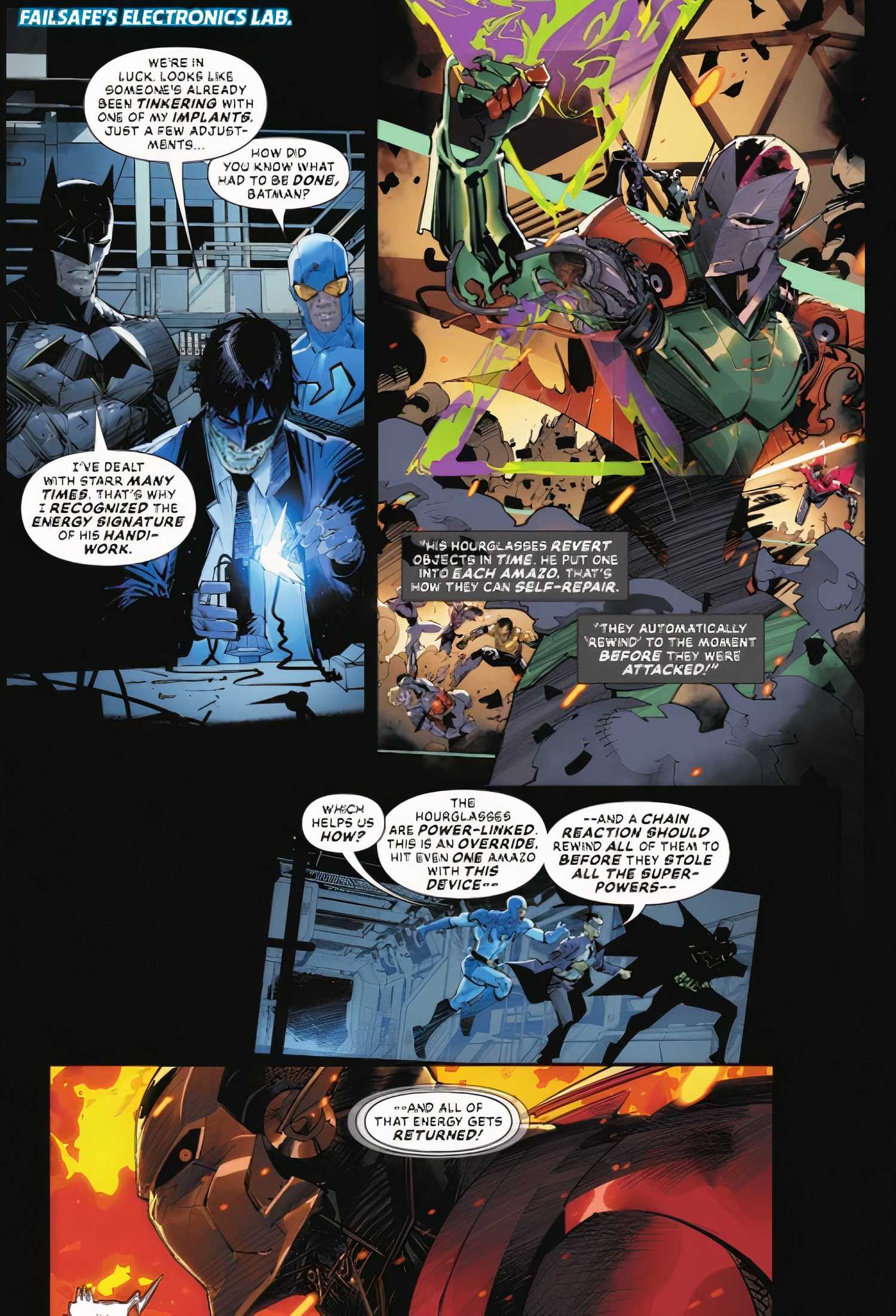 Con esta revelación, Batman convence a Starr para crear una anulación que revertiría a los Amazos al momento anterior a que robaran los poderes de los héroes de DC, mientras restauraba los poderes de los héroes. Esta anulación está diseñada solo para necesitar golpear a un Amazo, lo que desencadena una reacción en cadena en todos ellos. A pesar de Batman inicialmente planea realizar la anulación él mismo, pero es golpeado por uno de los Amazos, lo que hace que lo suelte. Por suerte, Green Arrow lo capta rápidamente. adjuntándolo a una de sus flechas y disparándolo a un Amazo. Esto desencadena la reacción en cadena, permitiendo a los héroes destruir a los robots.