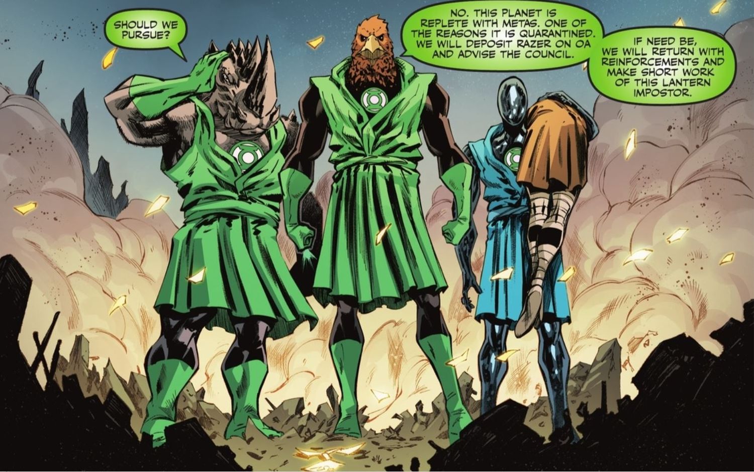 Green Lantern y Razer hablan con Madame Xanadu, pero el grupo es atacado por los Lanterns de United Planets que han venido a arrestar a Razer. En un movimiento que sorprende a Hal, los Linternas Verdes aprovechan brevemente las luces azules y amarillas para asegurar a su prisionero.