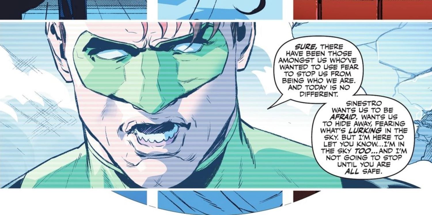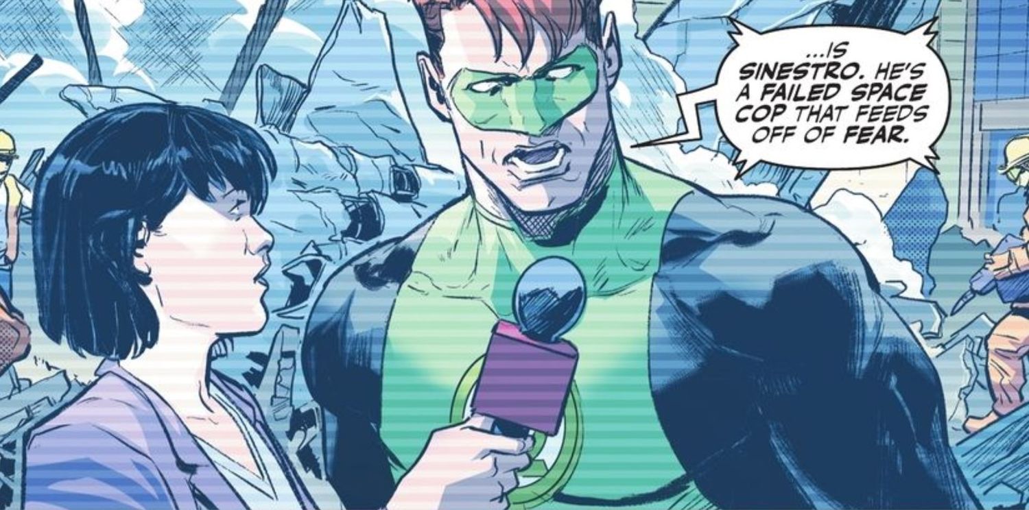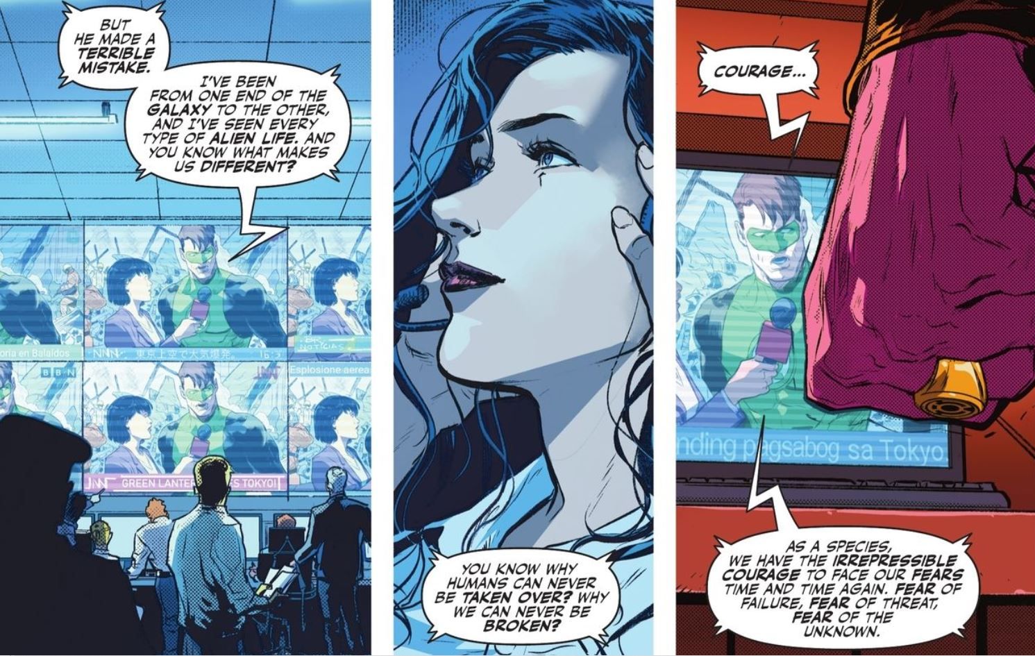 “/> Green Lantern interrumpe una transmisión de noticias en vivo para hablar directamente con la población de la Tierra. Hal informa a los espectadores sobre el plan de Sinestro y les dice que no funcionará porque de todos los tipos de vida extraterrestre que Green Lantern ha visto, ninguno posee el increíble coraje que posee la humanidad.