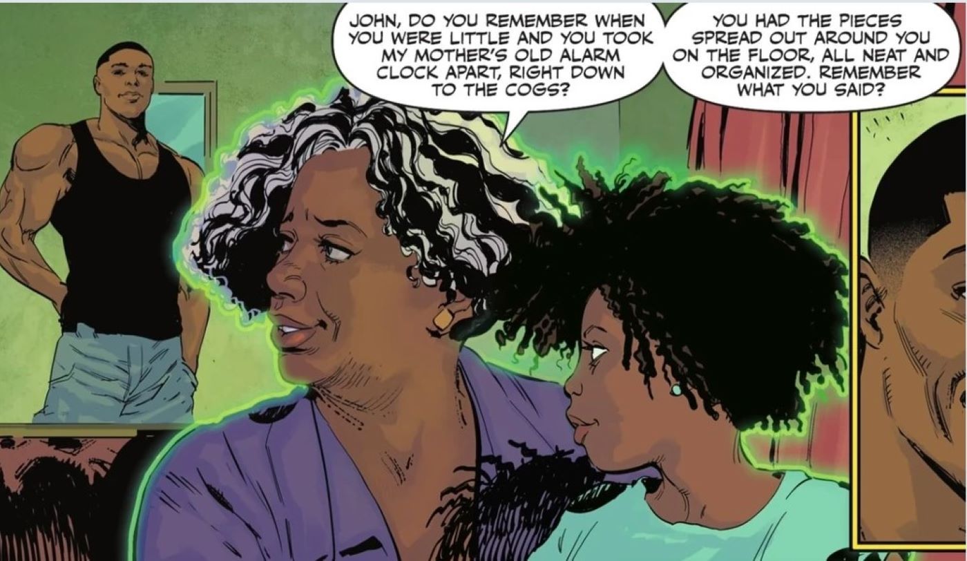 “/> Linterna Verde: Diario de Guerra El número 5 no es la primera vez que se muestra a John creando una construcción de su hermana fallecida, Ellie. Los lectores también lo vieron anteriormente crear una construcción de la joven en el número inaugural de la serie. La madre de John, que lucha contra la demencia, ocasionalmente olvida que su hija está muerta y, cuando no puede localizar a Ellie, se angustia notablemente. Para aliviar la angustia de su madre y revivir una fuente perdida de felicidad, John ocasionalmente crea construcciones protagonizadas por su hermana menor. Sin embargo, La construcción de Ellie en el número cinco se distingue de todas las iteraciones anteriores. y es mucho más que una simple construcción.