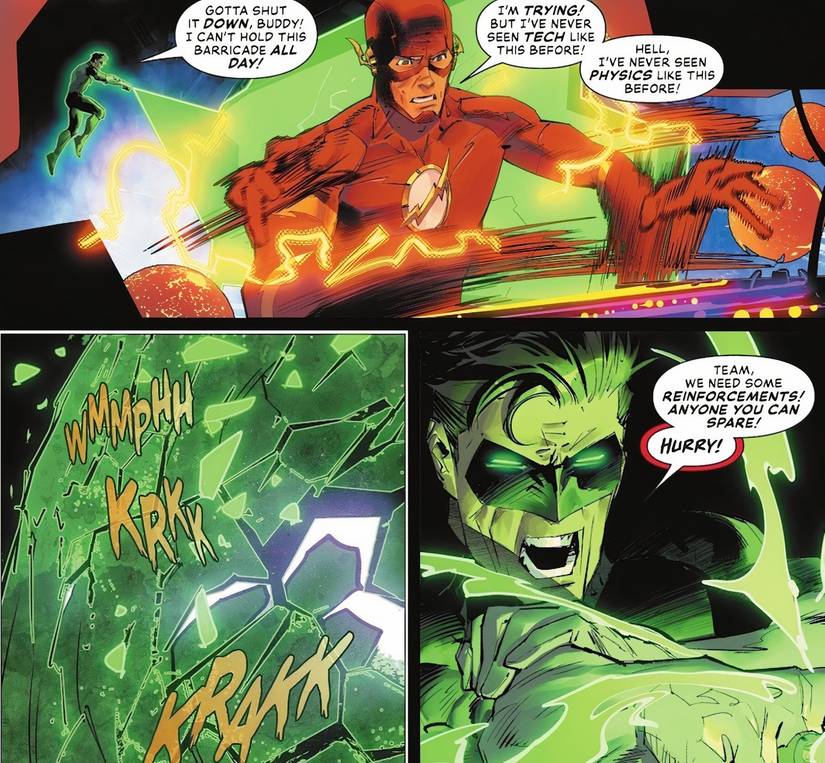 Mientras los villanos del multiverso atraviesan el portal, incluidos los infames Owlman y Ultraman de Tierra-3, Green Lantern crea una construcción para contener la brecha, evitando que los villanos pasen mientras Flash Barry Allen trabaja para cerrarla. El hecho de que Hal pueda por sí solo contener a todo un multiverso de villanos es una de las hazañas más impresionantes y poderosas. de cualquier personaje de DC. Su fuerza de voluntad es llevada al límite absoluto, lo que se hace evidente cuando su estructura comienza a resquebrajarse bajo la inmensa tensión. Sin embargo, Linterna Verde se mantiene firme y se niega a ceder.