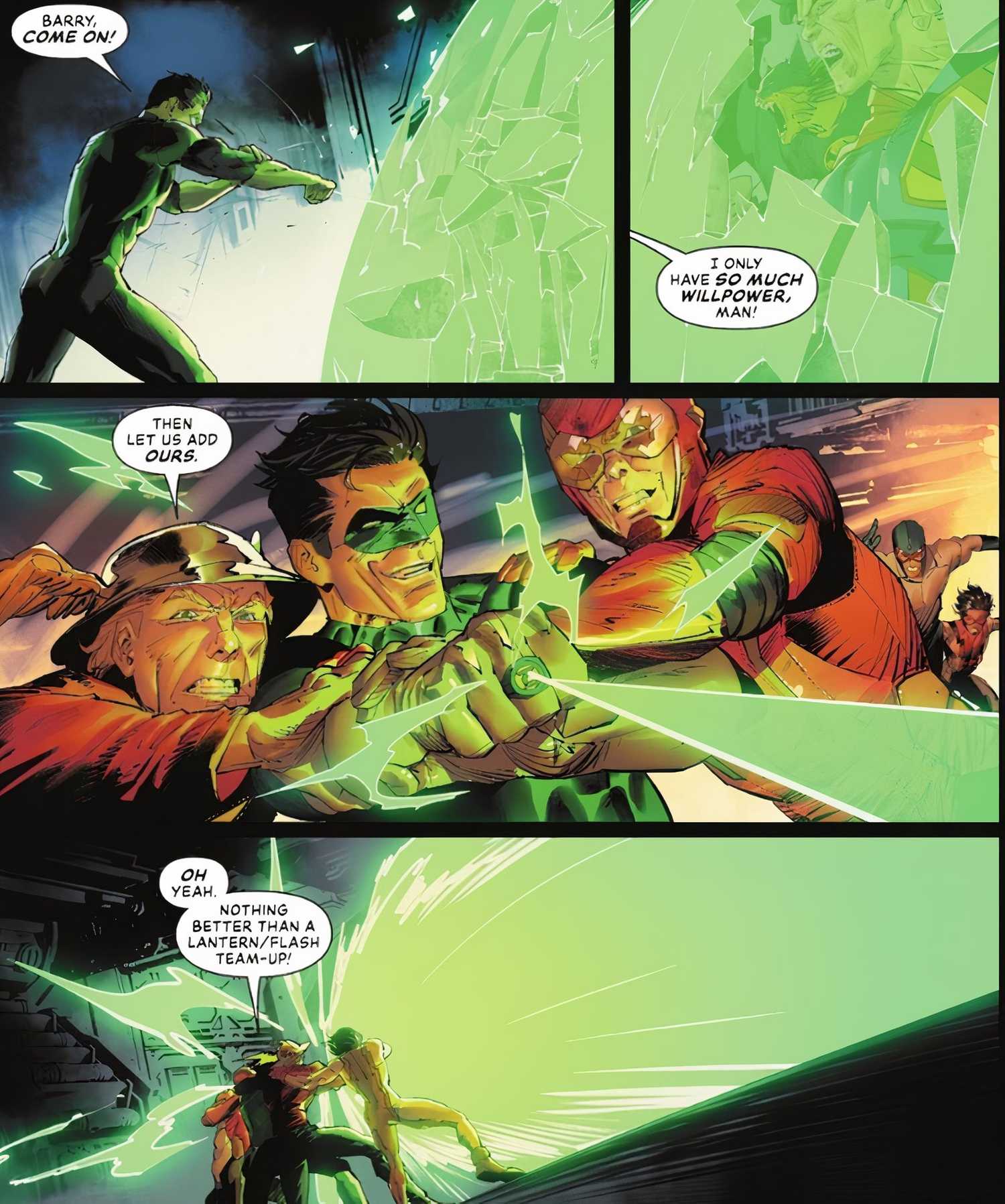 La táctica de burla de Green Arrow no es la única forma en que el anillo de Green Lantern ha recibido un impulso recientemente. En Poder absoluto #4, Hal mantiene a raya a los villanos de un multiverso con una de sus construcciones mientras intentan atravesar la máquina de transmateria de Amanda Waller. Bajo la inmensa tensión, la construcción de Hal comienza a resquebrajarse y grita que no puede contener el multiverso por mucho más tiempo debido a su fuerza de voluntad finita. Esto hace que los Flashes sin poderes (Jay Garrick, Wally West, Max Mercury y Bart Allen) presten su propia fuerza de voluntad a Hal, fortaleciendo su construcción. Por lo tanto, DC parece estar jugando rápido y libremente con las reglas de una Linterna Verde suena, y es innegablemente entretenido.