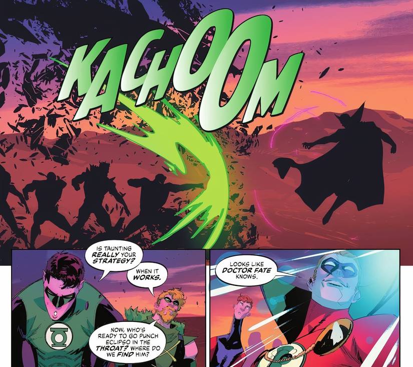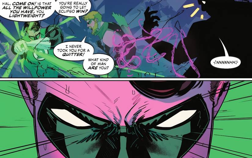 Al ver que la fuerza de voluntad de Hal no es lo suficientemente fuerte como para romper el diamante, Oliver le lanza insultos: “¡Hal, vamos! ¿Esa es toda la fuerza de voluntad que tienes, peso ligero? ¿De verdad vas a dejar ganar a Eclipso? ¡Nunca te tomé por un desertor! ¿Qué clase de hombre eres? Sorprendentemente, estas burlas funcionan y, momentos después, los héroes son liberados. Agotado por su demostración de inmensa fuerza de voluntad, Hal deja en claro que no está impresionado con la estrategia de Oliver, pero Green Arrow señala que funcionó, poniendo fin efectivamente a la discusión. De este modo, Parece que las burlas pueden sobrecargar el anillo de un Linterna Verde..