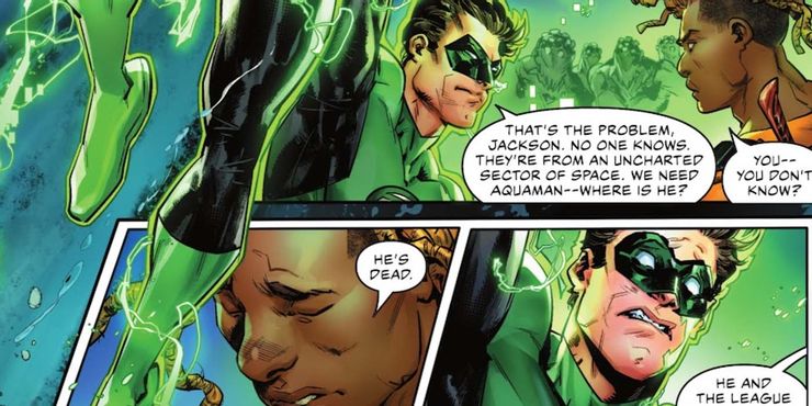 El rostro de Hal Jordan lo dice todo, ya que está abrumado por el dolor después de enterarse de las muertes de la Liga de la Justicia mientras estaba lejos de la Tierra. Si bien Green Lantern ocultaría rápidamente su tristeza y derrotaría a los atacantes alienígenas junto con Hyde, no hay duda de que Hal queda desconsolado. Después de todo, como uno de los miembros principales de la Liga de la Justicia y al no estar con ellos durante su misión final, Jordan debe sentir que podría haber ayudado o hecho algo. Pero en cambio, estaba fuera del mundo cuando sus aliados más cercanos murieron. Es una noticia devastadora para Green Lantern volver.