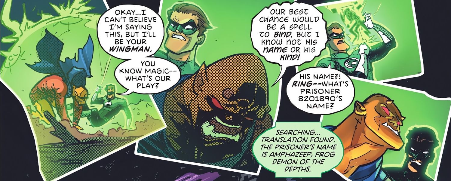 A Linterna Verde El anillo ya les permite hacer cosas extraordinarias y, sin embargo, un especial de Halloween revela que hay todo un mundo de potencial mágico que la mayoría de los Linternas Verdes han dejado sin explotar. En equipo con Etrigan the Demon, Hal Jordan muestra cómo se puede usar un anillo de Green Lantern para lanzar magia poderosa.